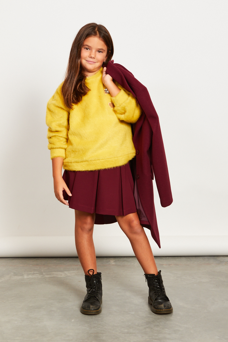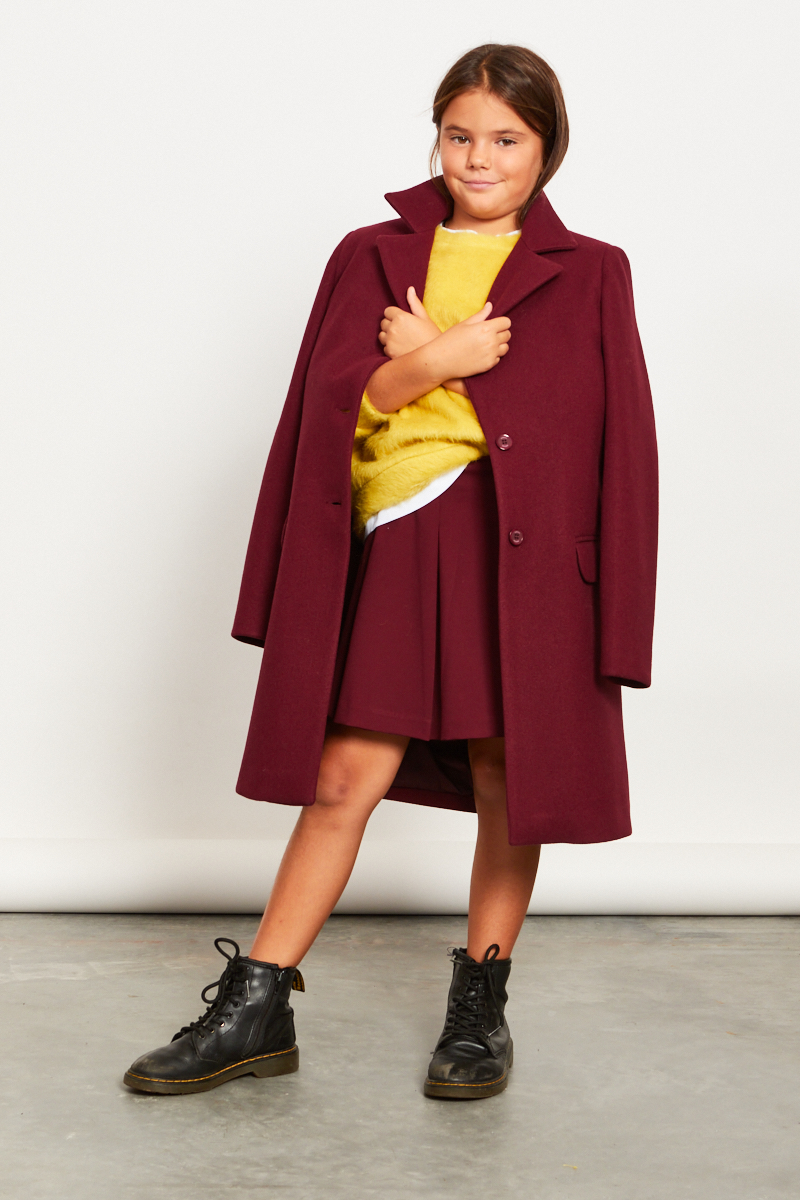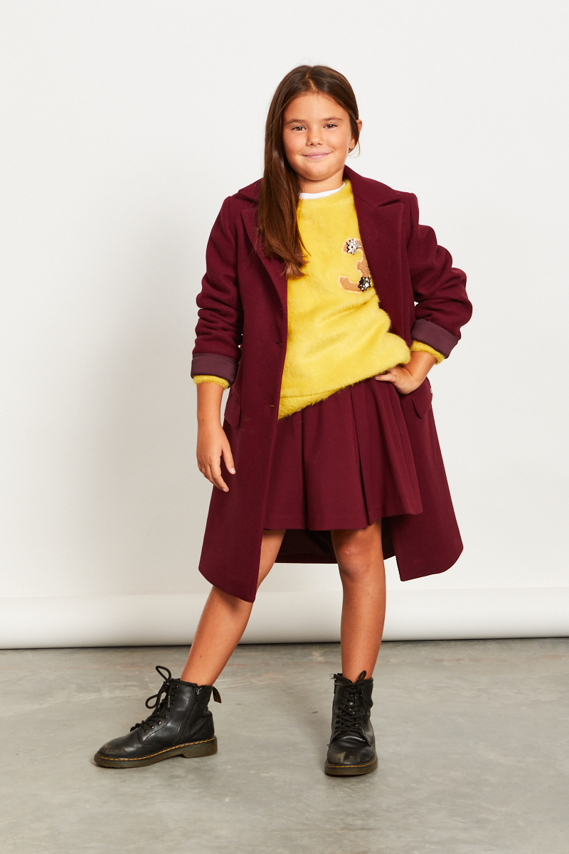 Home » Lookbooks » Lookbook bimbo » Look contemporaneo e spiritoso con minigonna a pieghe ( Cappotto e minigonna Kocca )