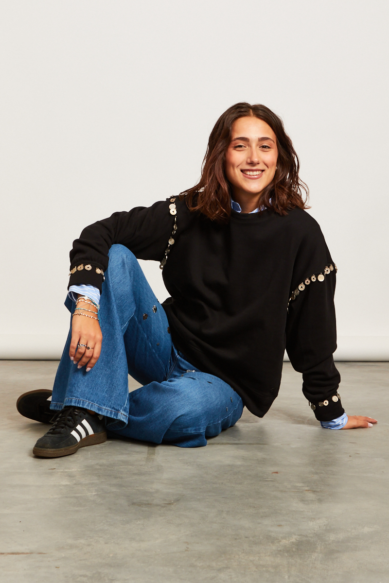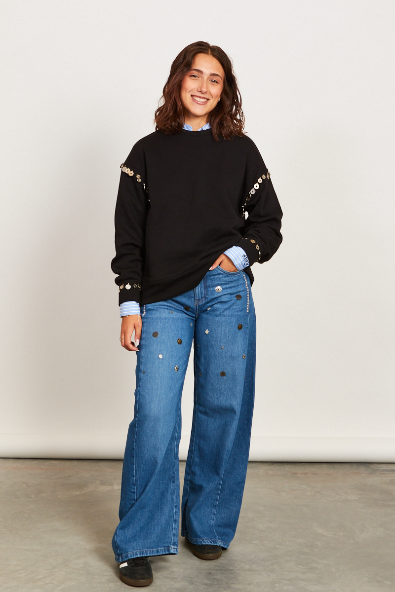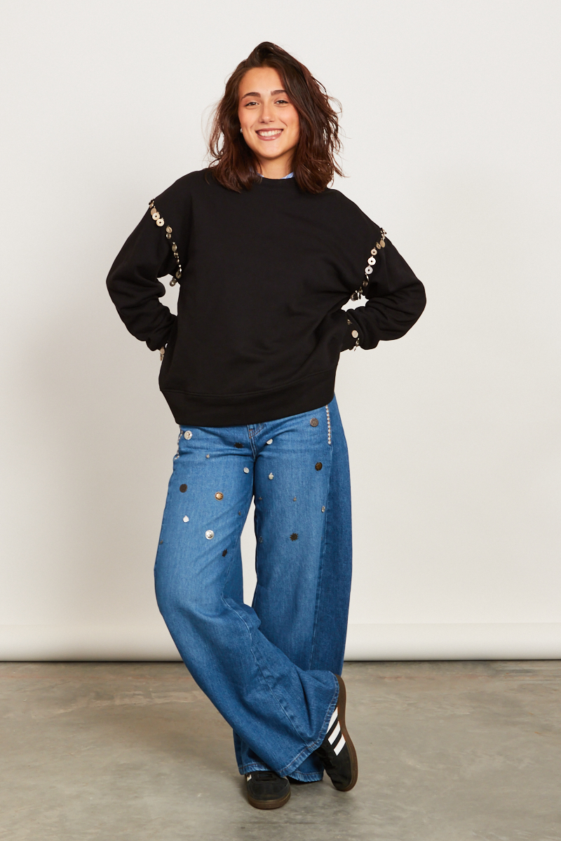Look Otto D’Ame casual-chic impreziosito da applicazioni di monetine che creano dettagli unici
