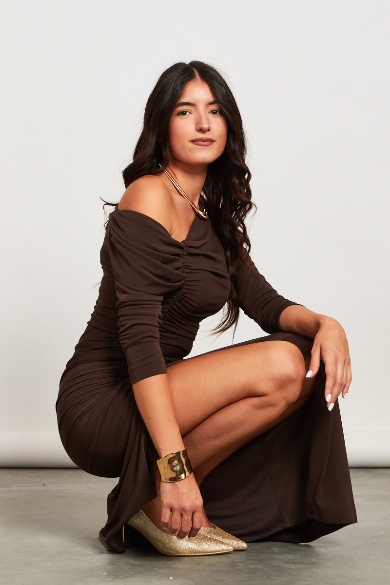 Look raffinato e sensuale in abito lungo jersey ideale per serate di gala o eventi speciali ( Carla Ruiz )